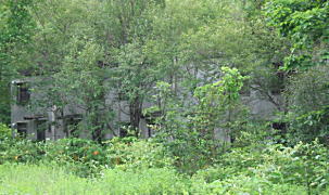 かつての鴻之舞の街の中心附近に近づいてくると、道脇にかつての「町名」 書いた案内板が立っている。 植物が繁茂しているこの季節には、道から確認できる遺構にも限りがあるよ うであるが、「住友」のシンボルマークを残した建物(道右側)や鉱山職員の住 宅遺構と思われる建物群を森の中にみることができた。 【写真左: 道道の左右にかつての「町名」を記した案内板が立つ 〜喜楽町跡 紋別鴻友会】 |