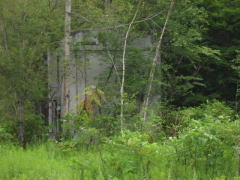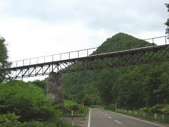 目的地が近づいてまづ目に入る遺構が、道道305号を跨ぐ「旧鴻紋軌道」の 橋梁である。「旧鴻紋軌道」は資材と鉱石の運搬のために紋別まで建設され た軽便鉄道路線だが実質的には戦後の非常に短い期間のみ使用された鉄道 である。道道を跨いでそびえる姿に歴史を感じる。写真は別の位置から遺構 を撮影したものであるが、軌道遺構は道道両側の深い森の中に続いており、 他の誰も通らない道道横で撮影するのもやや不気味な感じであった。 ※旧鴻紋軌道 昭和18年開通・昭和19年鉱山一時閉山により休止 昭和23年鉱山再開により復活・昭和24年廃止 【写真左:道道356号・築別炭鉱築別線沿いの鉄道遺構】 |