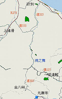 西興部から滝上に至り、R273渚滑国道を北上、「上渚滑・旭」附近から 右折して道道553号へ入り10kmで道道305号紋別丸瀬布線に合流。ここか ら鴻之舞附近までひたすら南下する。 快適な舗装道路であるが「築別炭鉱」の時と同様(というよりそれ以上)他の 車の姿を見ない。周囲の山・緑がさらに濃くなってくると下記の道標が現れた。 既に実質的には存在しない町の名前を目にすると、なんとも言えない期待感 と感慨が去来するのは私だけであろうか。そんなことを考える当方の横にいる 同行E氏は既に羆の存在の有無に感心が移ったようである。 ![]() 【道道305号・道標】 【写真左:鴻之舞周辺略図〜鴻之舞からダートの金八峠を抜けて丸瀬布へ】 |